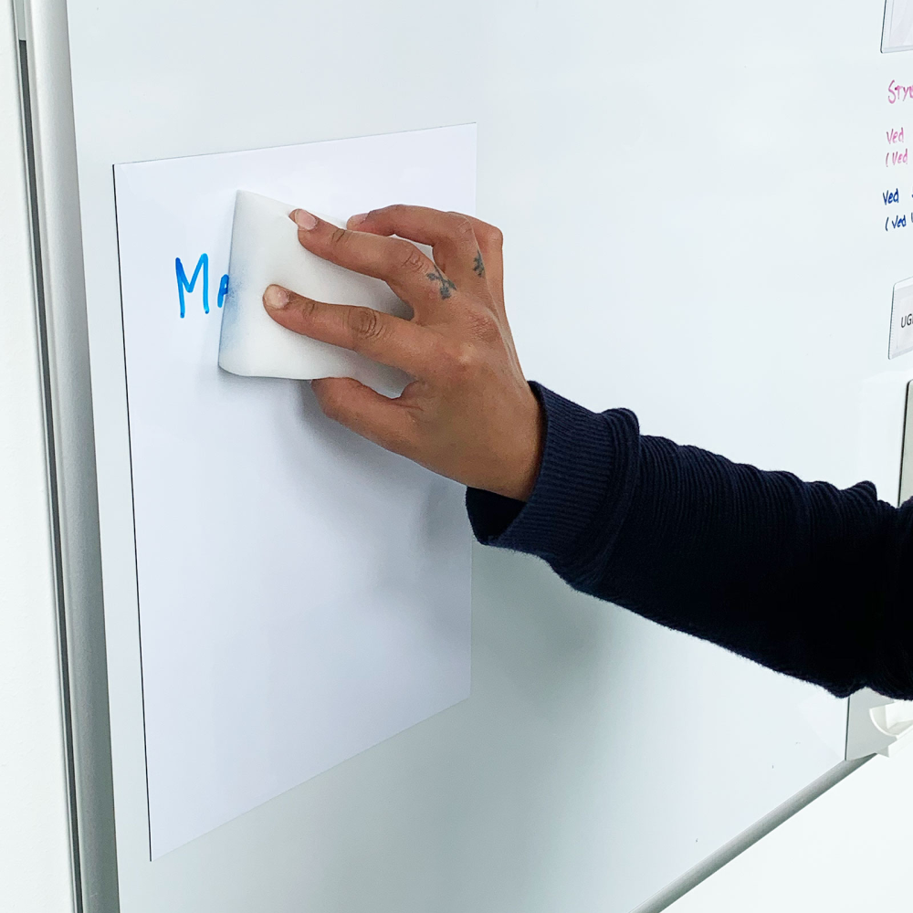 Husk at bruge whiteboard markers, så du kan viske arket rent igen. Kan fjernes igen med alm. tavlesvamp. Hvis du skriver med mørke farver og lader dem sidde længe, kan der komme små skygger, men de kan fjernes nemt med en mirakelsvamp.
